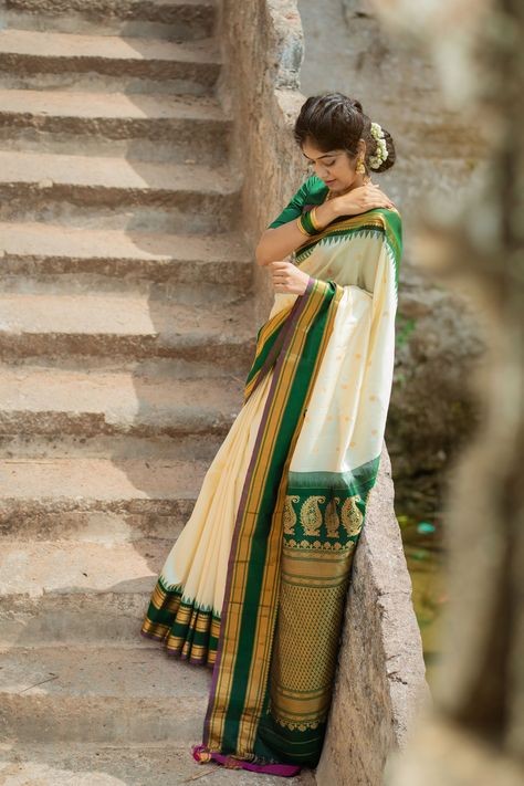 The unique feature of Gadwal Sarees lies in the interlockings or joints during weaving. There are two joints, one is called the vertical joint or vertical interlocking of the body of the saree with the border. The second joint is the horizontal joint or horizontal interlocking of the body of the saree with the pallu.